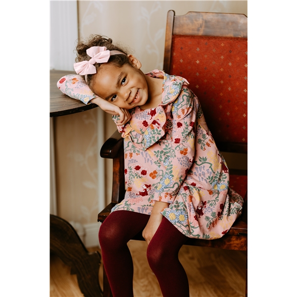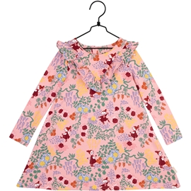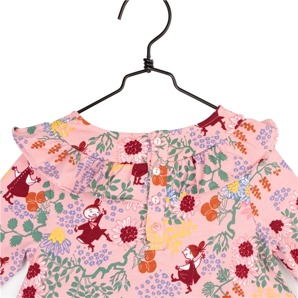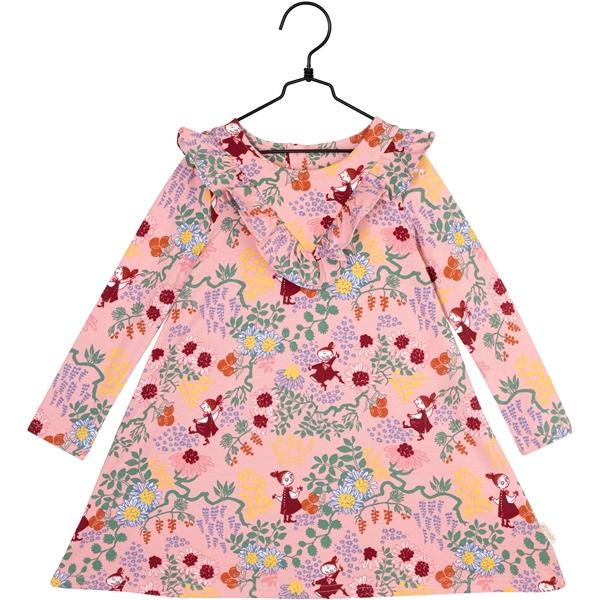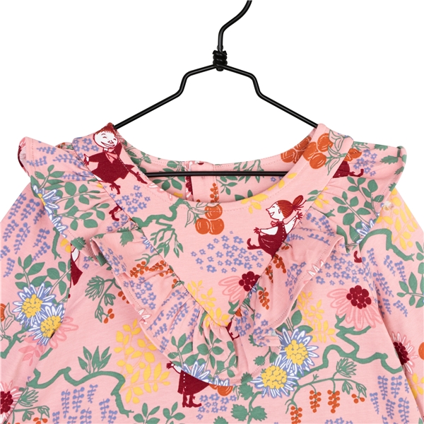 Mumin Mimosa Klänning Rosa är en långärmad, milt rosa klänning i lätt utställd modell. Klänningen är helmönstrad med Mymlan dansande i ett vackert blomstermotiv. Framtill, över axlarna och ned över ryggen finns det en fin volangkant, som tillsammans med de pärlemorskimrande knapparna i ryggen ger klänningen en festlig look.