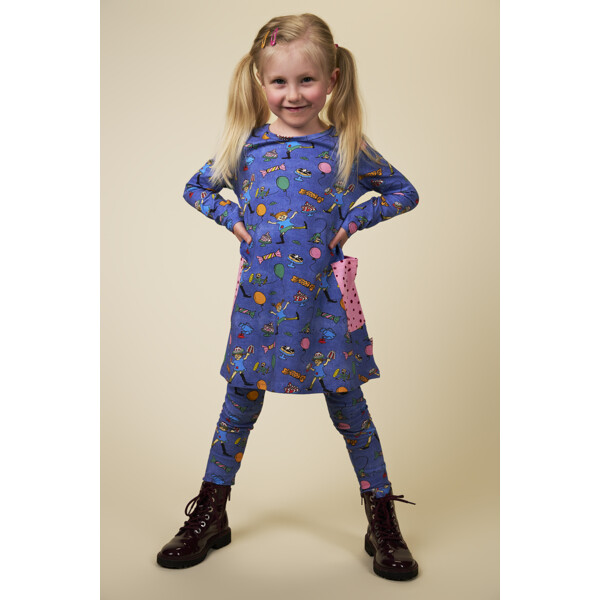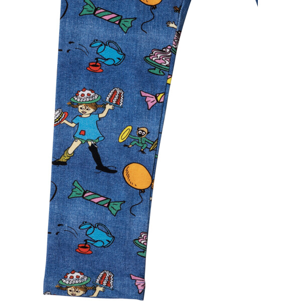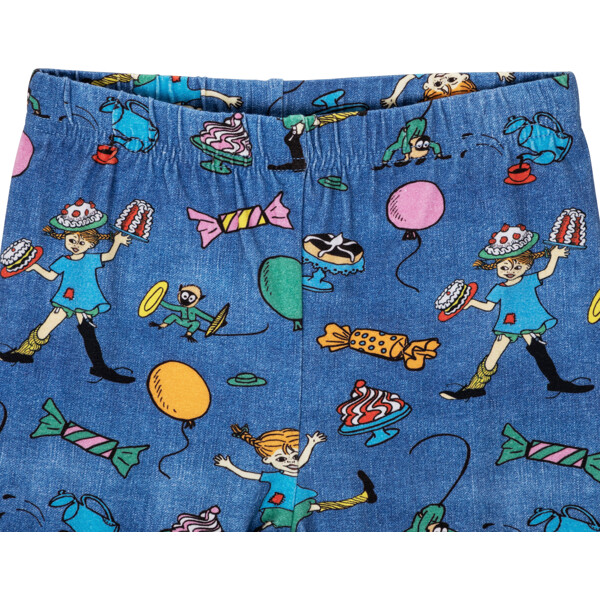 Mjuka och sköna Pippi Långstrump-leggings för barn, med infälld resår i midjan. Leggingsen är härligt denimblå med festligt mönster. Produkten innehåller certifierad ekologisk bomull.