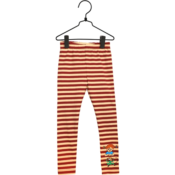 Pippi Långstrump Kompisar Leggings Röd är leggings i röd- och beigerandigt. På ena benet finns ett tryck med kompisarna Pippi och Herr Nilsson.