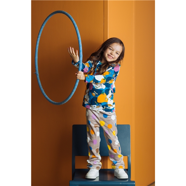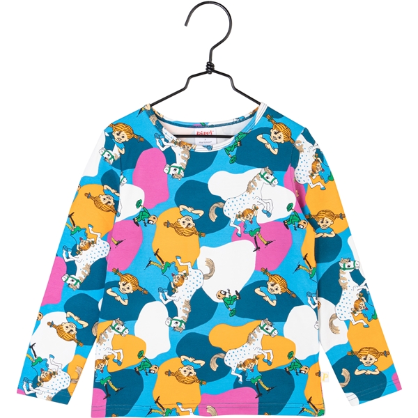 En långärmad, färgglatt helmönstrad trikåtröja i rak modell, med Pippi Långstrump, Lilla Gubben och Herr Nilsson bland fina färgfläckar i blått, orange, vitt och lila.