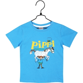 En härligt färgglad t-shirt i rak modell. T-shirten är tillverkad i 100% bomull och framtill finns det ett stort tryck i färg, där den starka tjejen Pippi Långstrump lyfter upp sin häst på raka armar! Pippi Långstrump står det i stora, glada bokstäver, med Herr Nilsson som klättrat upp på ett gult P.