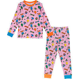 En tvådelad Pippi Långstrump-pyjamas för barn, i rosa med festligt helmönster och olikfärgade muddar i ärm- och benslut. Tröjan har lång ärm och rund halsringning. Byxan har infälld resår i midjan. Tillverkad i bomull.