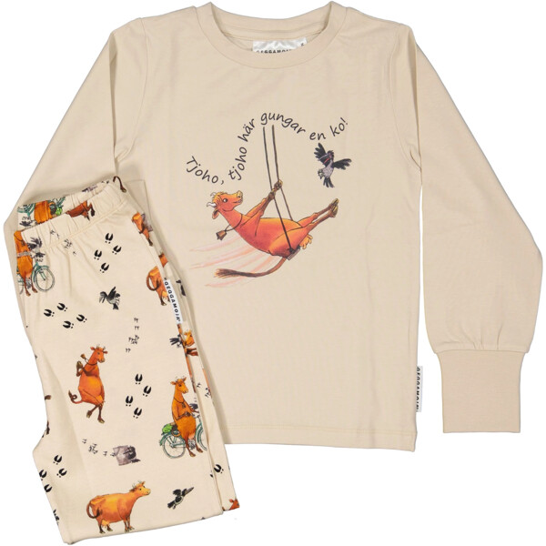 Tvådelad pyjamas med Mamma Mu i mjuk och skön ekologisk bomull. Pyjamasen består av ett par byxor med resår i midjan och breda muddar och en långärmad tröja även den med muddar.
