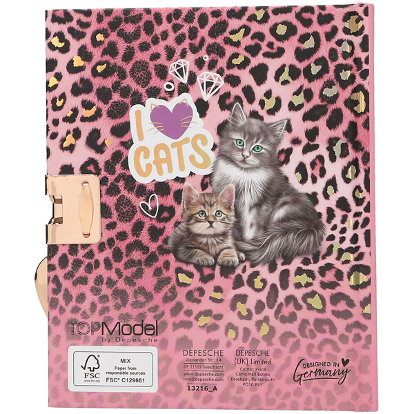 Denna fina dagbok i färgglad leo-look och med ett coolt modellmotiv har ett sött hjärtformat lås med två nycklar och fint linjerade sidor på insidan.Den matchande pennan skriver med osynligt bläck som bara blir synligt närdet belyses med UV-ljuset från diamanttoppen. Batterierna i pennan är utbytbara.