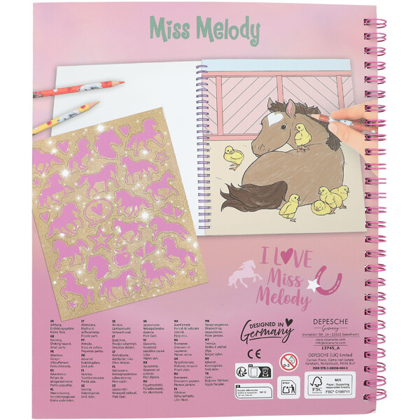 Denna fina målarbok från Miss Melody med spiralrygg har ett storthästmotiv och en gullig kattungeapplikation med paljettdetaljer påframsidan.