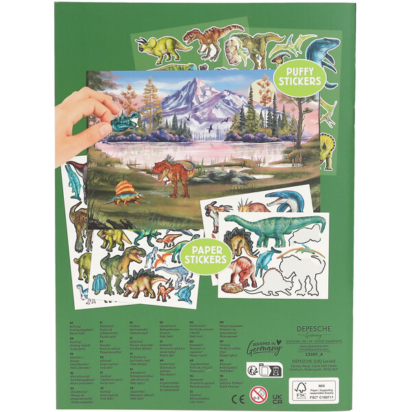 Dinotastisk pysselbok från Dino World med 84 häftiga dinosaurieklistermärken (4 ark med pappersklistermärken, 2 ark med Puffy-klistermärken i skum) som ger liv åt de 20 urtidsbakgrundssidorna.