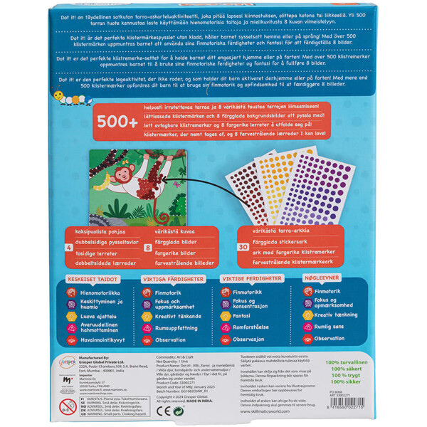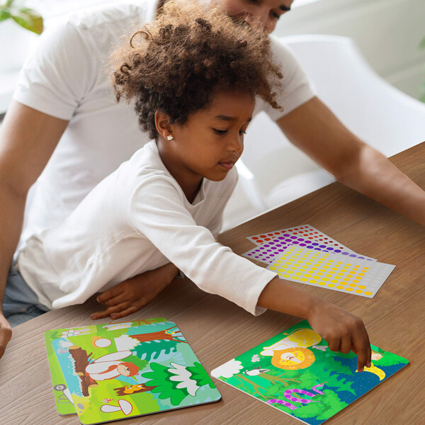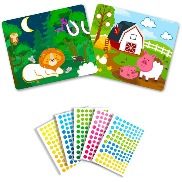 Med över 500 runda klistermärken i olika storlekar och färger kan barnet använda sin fantasi för att färglägga de medföljande bildkorten. Temat är vilda djur, lantgårdens djur och havsdjur. Utvecklar finmotorik, pincettgrepp, kreativt och rumsligt tänkande, öga-hand koordination och koncentration.