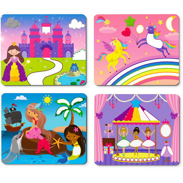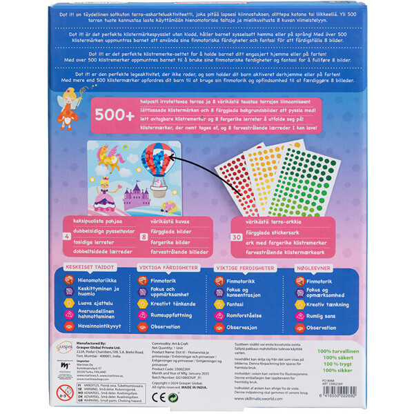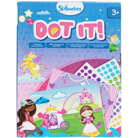 Med över 500 runda klistermärken i olika storlekar och färger kan barnet använda sin fantasi för att färglägga de medföljande bildkorten. Temat är magiska enhörningar och prinsessor. Utvecklar finmotorik, pincettgrepp, kreativt och rumsligt tänkande, öga-hand koordination och koncentration.