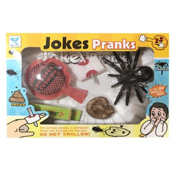 Ett set i 5 delar med olika skämtartiklar. Klassiker som pruttkudde, spindel, tuggummipaket, spik i plåster och bajskorv!