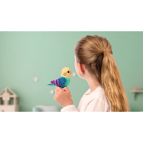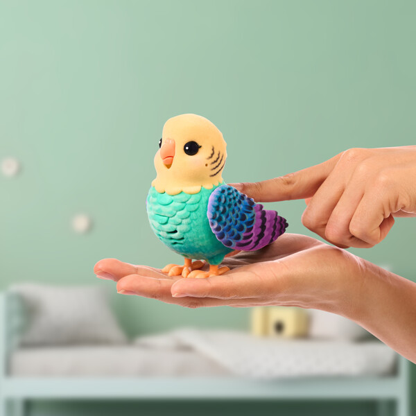 Min Riktigt Riktiga Fågel ser och låter precis som en riktig fågel, med verklighetstrogna flockade fjädrar, rörlig näbb och visslande fågelljud.