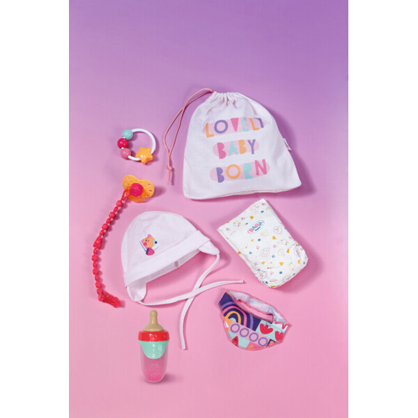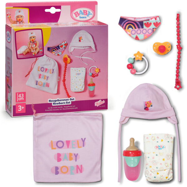 Innehåller: - BABY born nyfödd startpaket med flaska, luva, halsduk, skallra, napp och snöre.