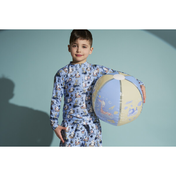 En uppblåsbar Mumin-strandboll med växelvis ljusblå och gula fält. Det somriga motivet består av muminfigurerna som njuter av en härlig dag på stranden.