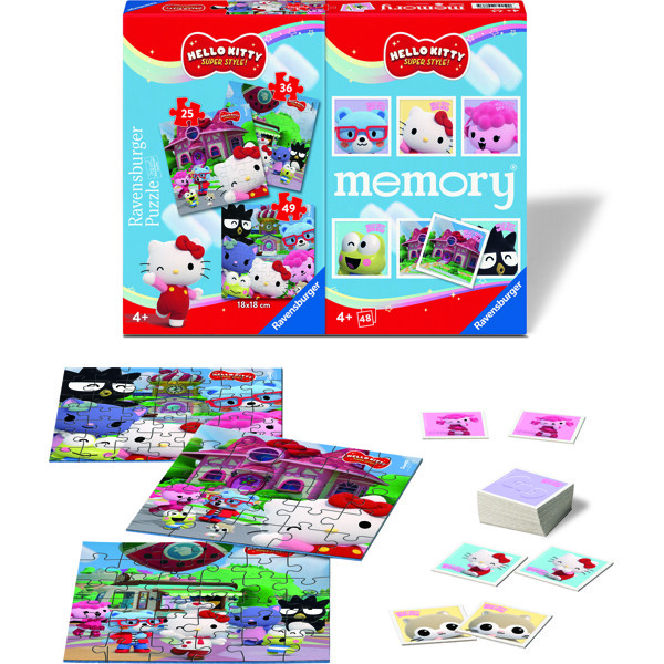 Fyra Ravensburger-klassiker möter Hello Kittys förtrollande, färgstarka värld: Ett memory-spel med 48 kärleksfullt designade kort och tre färgstarka pussel med varierande antal bitar säkerställer varierad och rolig lekstund i barnrummet.