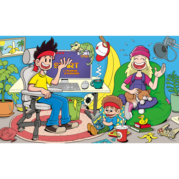 Ett 100-bitars pappussel med Yumi & Tomu där de båda chillar framför skärmen.
