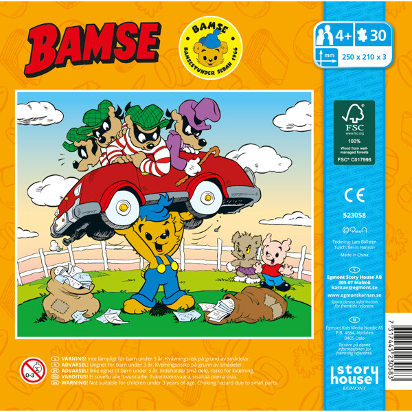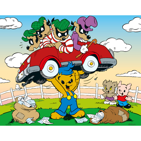 Ett fint träpussel med Bamse. Bamse är ute på äventyr och stöter plötsligt på ett gäng busar.