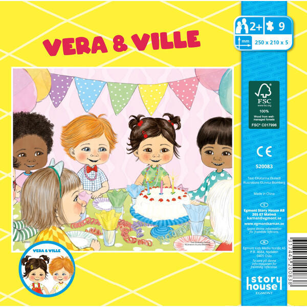 Ett fint träpussel med vännerna Vera och Ville. Följ med Vera och Ville på kalas med deras vänner.