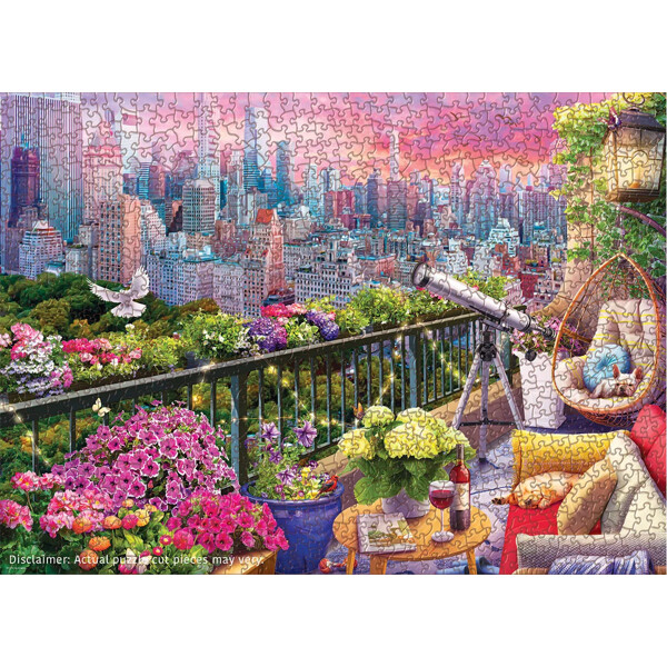 Koppla av på ett frodigt tak i New York där blomlådor svämmar över, ljusslingor glöder och ett teleskop pekar mot en pastellrosa silhuett över Central Park. Med tydliga zoner – solnedgångshimmel, skyskrapor, träd, räcke, blommor, teleskop och mysiga sittplatser – är detta ett välbefinnande motiv.
