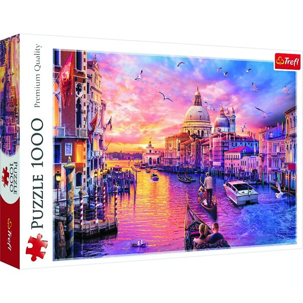 Pussel 1000 Bitar Trefl The Carms Of Venice föreställer en romantisk scen på Venedigs stora kanal. Vackra byggnader, fåglar och en rosa himmel.