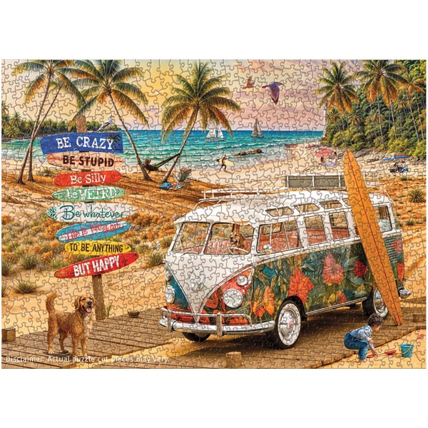 Njut av lite glädje vid havet! En klassisk Volkswagenbuss i tropiska blommor, surfare som jagar vågor, en glad valp på strandpromenaden och en färgglad strandskylt som påminner oss: var galen, var konstig – livet är för kort för att vara något annat än lycklig. Med tydliga zoner – turkost hav, palmer, väderbitna brädor och den ikoniska bussen med delade fönster – kan alla hitta en favoritdel.