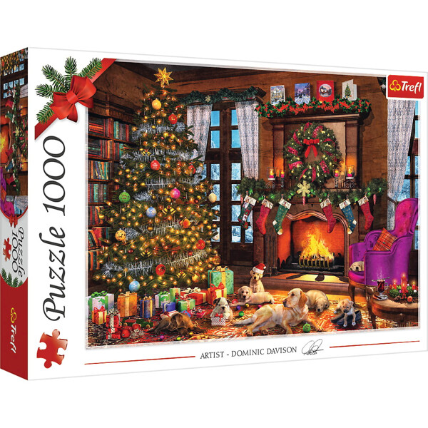 Pussel 1000 Trefl Bitar Christmas is Coming är ett pussel som gör att du kommer i julstämning! Söta hundar ligger på mattan framför den öppna spisen med en vackert pyntad julgran.