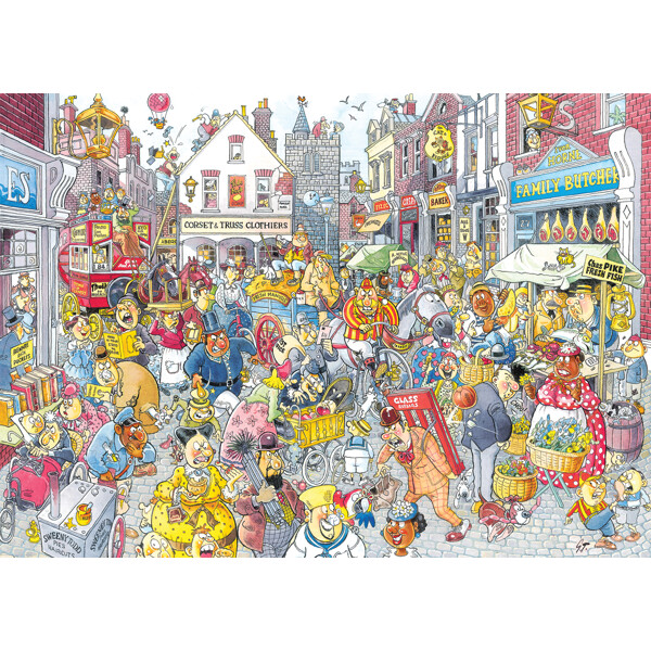 Ta en resa tillbaka till 1860-talet, där gatorna levde av ljudet av klapprande hovar, kärror och skrikande ståndsinnehavare. Hästdragna vagnar kämpar om plats med sotare, skumma barberare och busiga barn. Denna huvudgata är mer fullpackad än en viktoriansk korsett! Föreställ dig hur denna huvudgata ser ut i framtiden. Det är scenen du ska pussla!