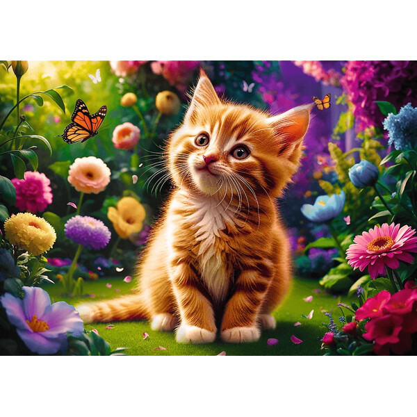 Pusslet föreställer en söt kattunge omgiven av fjärilar och blommor i vackra färger.