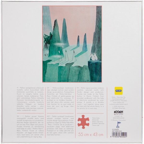 Detta 750-bitars pussel har ett motiv av konstnären och författaren Tove Jansson. Bilden är hennes förtrollande illustration från den andra muminboken Kometen kommer, som publicerades år 1946.