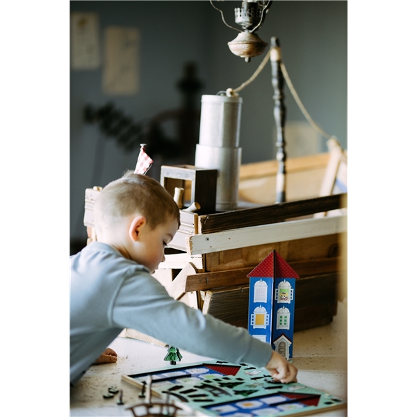 Mumin Bygg och Lek är en rolig leksak för barn att pyssla ihop och leka med. Pyssla samman det blå Muminhuset, bron, granarna och figurerna innan leken kan börja. När leksetet inte används står det fint på hyllan som en dekoration eller kan sättas tillbaka i brickan.