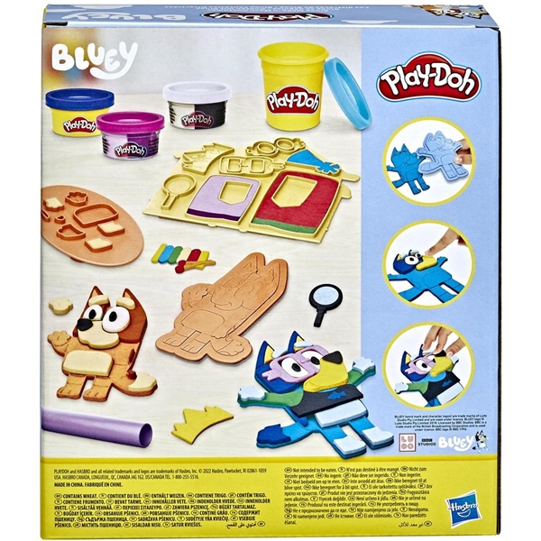 Följ med Bluey och hennes syster Bingo i deras utklädningslek! Detta Play-Doh-lekset ger barn ett sätt att återuppleva sina favoritögonblick från showen när de klipper, formar och stämplar kostymer för dessa två lekfulla valpar. Barn kan klä Bingo och Bluey i baddräkter, prinsesskostymer, fåniga mormorsfiltar och mer med stämplarna. Gör bara Bluey och Bingo och lägg sedan på detaljer som ögon, hattar, kläder och accessoarer.