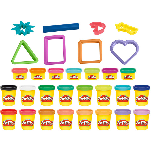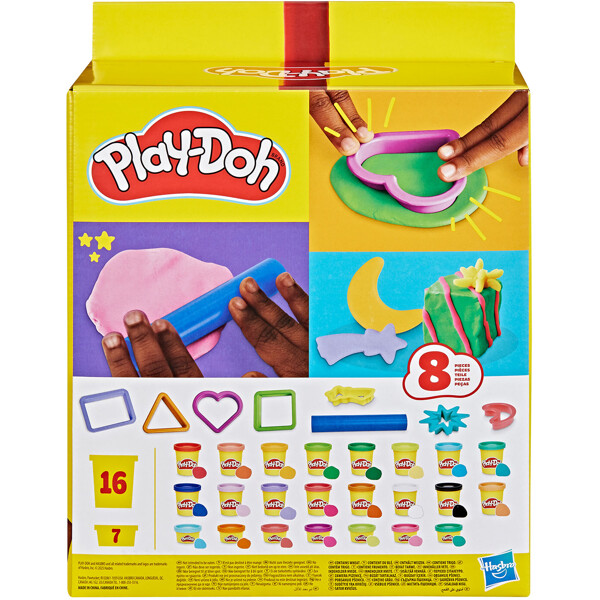 Setet är utformat för att väcka kreativiteten hos barn med 23 burkar med livfull modelleringsmassa och 8 viktiga Play-Doh-tillbehör. Setet innehåller 7 utskärare i roliga former som triangel, rektangel, kvadrat, hjärta, måne, komet och stjärnfall, så att barnen kan utforska olika former och mönster. En rulle medföljer också för att jämna ut massan och göra det lättare att använda utskärare.