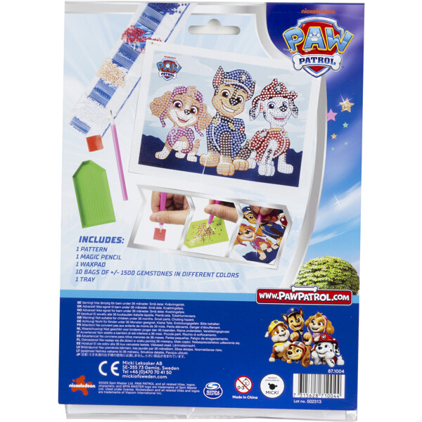 Med över 1 500 små diamanter och en tavla fylld med nummer är det enkelt och roligt för barnen att sätta igång. Följ siffrorna, plocka upp rätt färg med pennan och fäst diamanterna på rätt plats. Bit för bit växer ett färgsprakande PAW Patrol-motiv fram som blir som en tavla när barnen har pysslat färdigt!