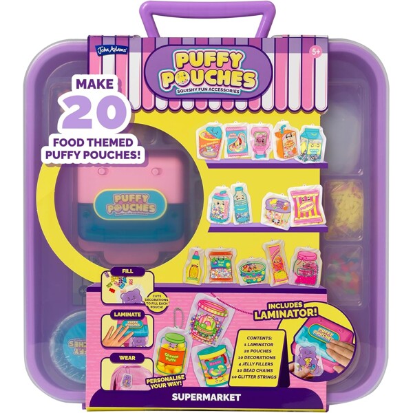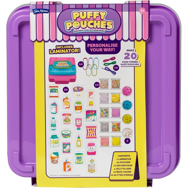 Använd geléfyllningen, de söta dekorationerna och kulkedjorna för att göra 20 unika puffy pouches personliga. Stäng påsarna med laminatorn, häng dem på din väska - eller byt dem med dina vänner!Innehåller:- 1 laminator- 20 små påsar- 10 påsar dekoration- 4 geléfyllningar- 10 kulkedjor- 10 glitterband- 1 bärväska