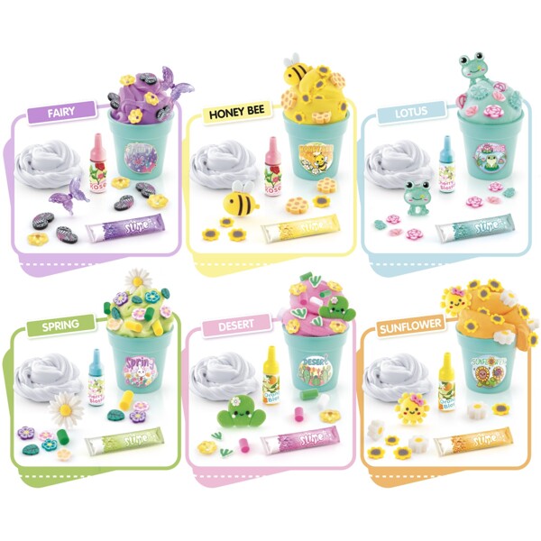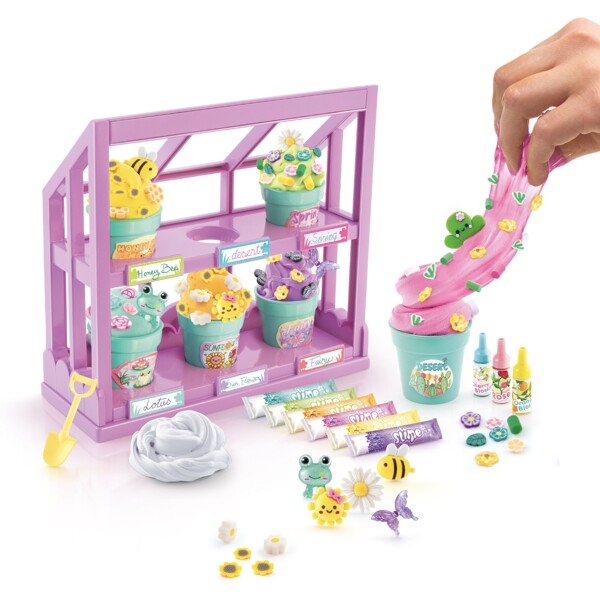 Skapa färgstarka och doftande slime med tre unika konsistenser. Tillsätt dekorationer och förvara dina skapelser i sex stycken söta blomsterkrukor i ett charmigt växthus.