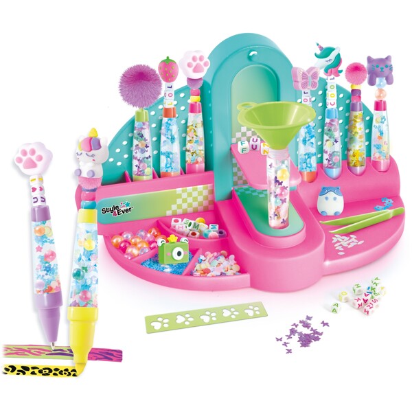 Skapa din egen samling av DIY-kulspetspennor och överstrykningspennor! Använd ”fabriken” för att fylla dina pennor, tillsätt vatten och dekorationer – och gör dem helt unika, ända ner till suddgummit! Dekorera 8 pennor och överstrykningspennor med massor av roliga tillbehör som ingår.Innehåller:- 1 studio- 6 DIY-kulspetspennor- 6 avtagbara spetsar- 2 DIY-överstrykningspennor- 1 pincett, 1 tratt, 1 sked- 1 ark med klistermärken- 2 mönstermallar- 8 dekorativa suddgummin- 5 påsar med dekorationer- 3 påsar med pärlor- 1 påse med pomponger- 1 bruksanvisning