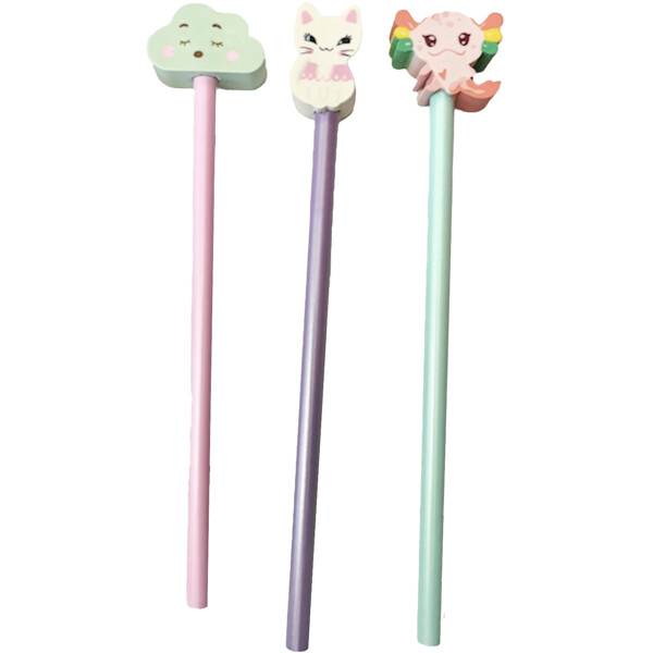 Ett fint set med tre blyertspennor med söta suddisar. Pennorna kommer ovässade i härliga pastellfärger och pryds med söta sudd i form av ett moln, en katt och en axolotl.