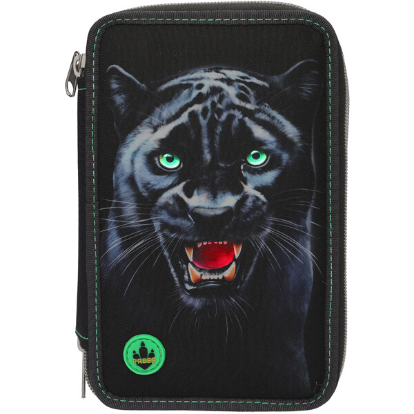 Coolt pennfodral från Adventure World PANTHER-serien i mörkgrått medgröna detaljer och ett stort motiv av en svart panter på framsidan vars ögon och mun lyser upp i ca 15 sekunder när man trycker på knappen.