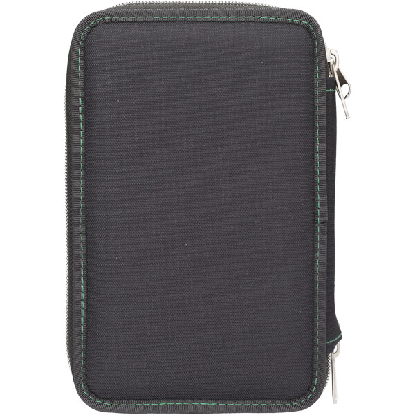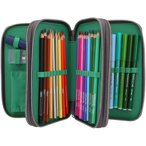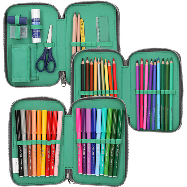 De treseparata facken är komplett fyllda med allt som behövs för att rita, skriva och pyssla: vardera 18 färg- och tuschpennor, 2 blyertspennor,pennvässare, suddgummi, linjal, sax, limstift samt en liten kardborreficka.