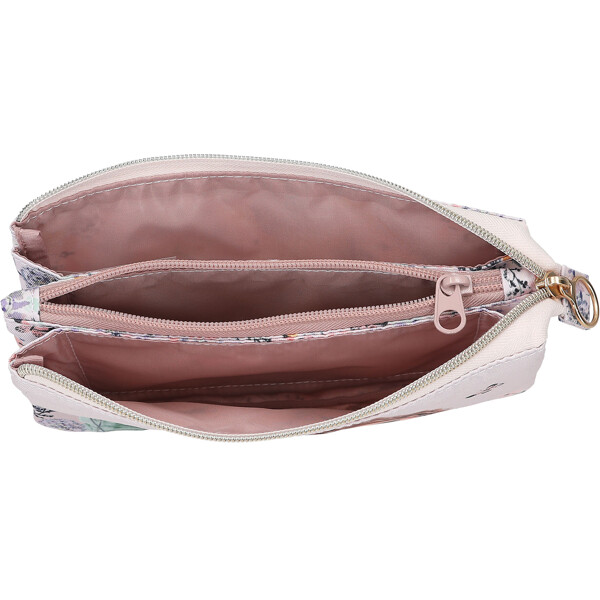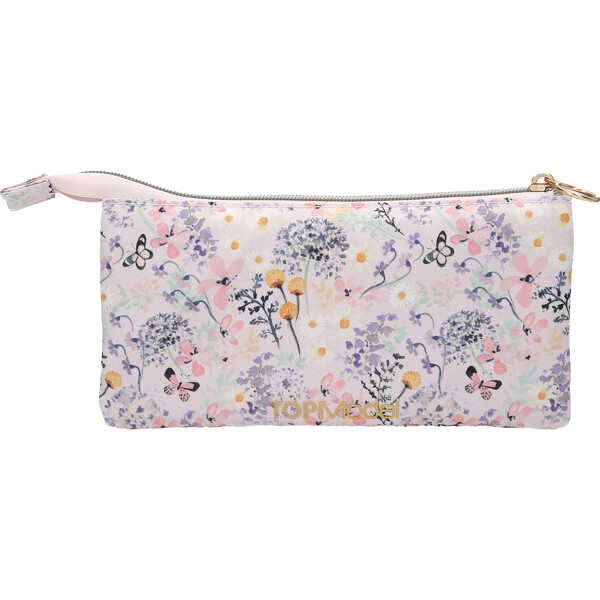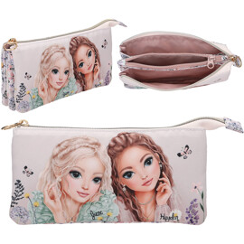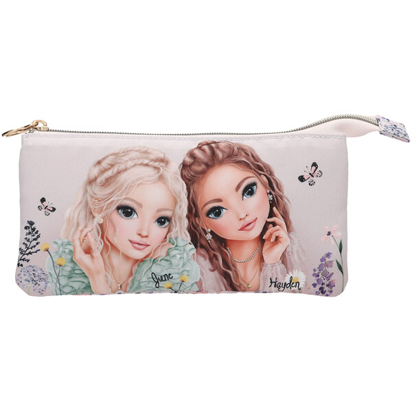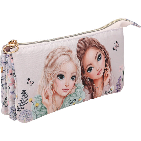 Praktiskt pennfodral från TOPModel-serien SUMMER FEELING med ett romantiskt modellmotiv på framsidan och ett fint mönster av blommor och fjärilar på baksidan. Med två dragkedjor och hela tre fack att förvara pennor, smink eller annat smått.