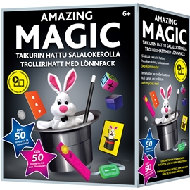 Trollerihatt 50 Tricks är ett trolleriset för barn med 50 trick och illusioner. Välj bland alla trolleritricks som finns och sätt ihop en show och bjud in familj och vänner på en magisk afton. Glöm inte det klassiska tricket med trollerihatten som har ett lönnfack som kan trolla fram en kanin. Använd de magiska mynten, sicksack-snöret och de magiska korten för att bjuda på fantastiska trick och illusioner.