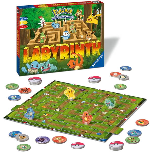 Labyrinth Pokémon är det roliga sällskapsspelet nu med tema av Pokémon. Utforska labyrinten med Pikachu, Squirtle eller Bulbasaur för att hitta Eevee, Gengar och de andra karaktärerna. Se vilka Pokémon som du behöver fånga härnäst och organisera sedan om i labyrinten för att nå dem. För att vinna spelet behöver du bli den första som fångar alla Pokémons på dina Pokéboll-marker och sedan gå tillbaka till din startpunkt.
