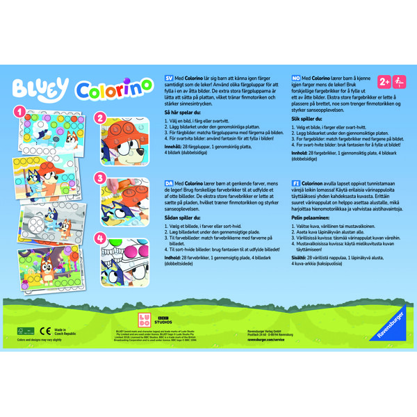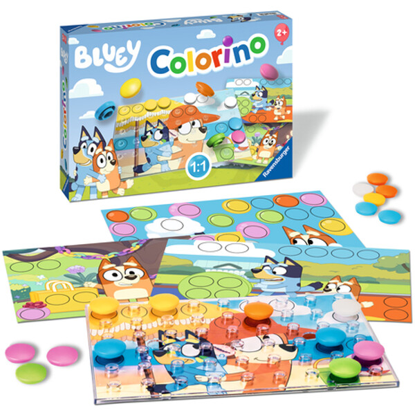 Välj en bild från Bluey, lägg den under spelbrädet och sätt de stora färgplopparna på rätt plats. Röd på röd, blå på blå! Med Colorino lär sig små barn färger, tränar finmotorik och har kul samtidigt.