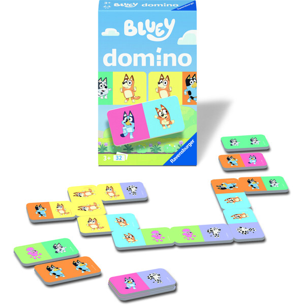 Dominobrickorna har fina bilder på Bluey och hennes vänner. Ett klassiskt och roligt spel som tränar både koncentration och förmågan att känna igen mönster på ett lekfullt sätt!