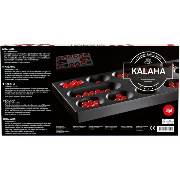 Kalaha är ett spel med uråldriga anor! Detta utmanande spel går ut på att flytta 72 kulor längs brädet för att så många av dem som möjligt ska hamna i din egen skål. Här är det din taktiska färdighet som ska tas fram för att vinna spelet! Kalaha har spelats i många hundra om inte till och med tusentals år i många olika delar av världen. Detta gör Kalaha till ett otroligt spännande, utmanande och klassiskt spel i klass med schack!Ålder: 7+