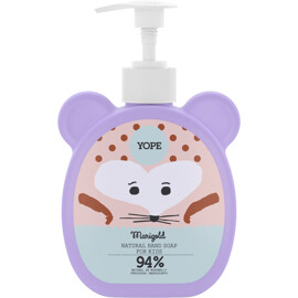 YOPE Marigold Natural Hand Soap for Kids är ett nöje för hela familjen, tack vare skonsamma naturliga tvätt- och fuktgivande ingredienser, idealisk för huden på barn över 3 år, ett neutralt pH, en lättsköljd konsistens, aktiv aloe vera gel som lugnar och återfuktar på djupet, nyttiga ingredienser med konserverande egenskaper istället för skadliga konserveringsmedel.Innehåller även naturligt ringblommaextrakt, som påskyndar läkningen av inflammationer och påskyndar hudens förnyelse. Lämnar huden återfuktad, näring, stärkt, skyddad och lugnad.Den fantastiska doften av honung direkt från burken är tilltalande för både barn och vuxna och kommer säkerligen att ge alla en bättre hygien.Barn bara älskar den söta djurkaraktären och den unika flaskformen med öron samt den färgglada återvinningsbara förpackningen.Denna honungsdoftande tvål vårdar huden skonsamt och gör det roligt att tvätta händerna!