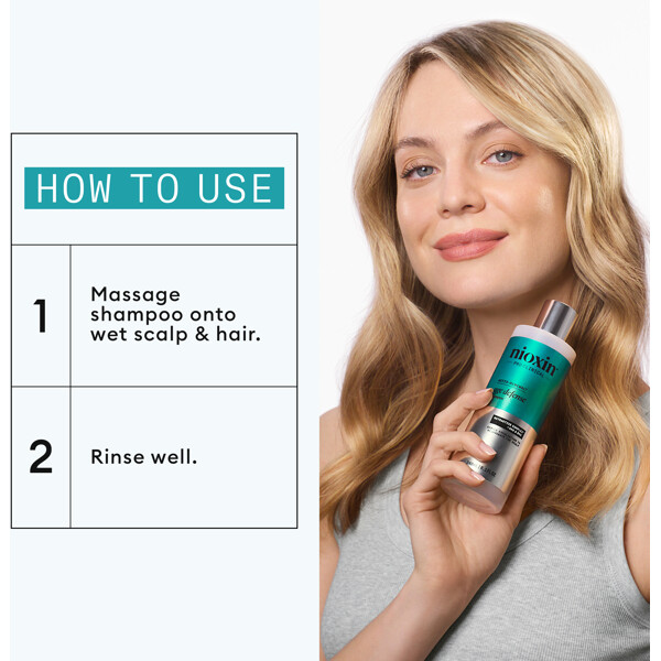 Massera in i vått hår och hårbotten tills ett rikligt skum bildas. Skölj noggrant. För bästa resultat – följ upp med Nioxin Age Defense Conditioner och Age Defense Serum.
