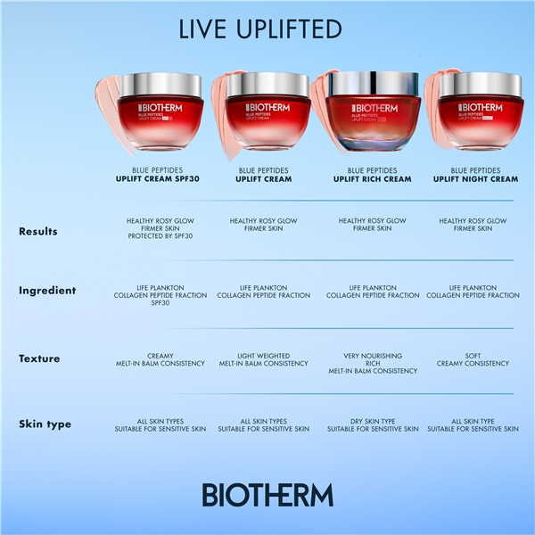 Blue Peptides Uplift Cream är en fuktgivande och uppstramande dagcreme för alla hudtyper som även är lämplig för känslig hud. Genom att omfamna banbrytande biovetenskapliga innovationer kombinerar formulan Biotherms signaturingrediens Life Plankton™ med kollagenpeptid-fraktioner som kompenserar för de synliga tecknen på kollagenförlust i huden och bidrar till att bevara en fast och synligt uppstramad hud.