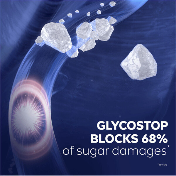 Kliniskt bevisade resultat på bara 2 veckor med minskade rynkor för 91% kvinnor (instrumentell mätning av rynkors volym, 24 kvinnor, 2023). Den innovativa ingrediensen GLYCOSTOP verkar som en sköld genom att blockera glykering upp till 68%, för att motverka rynkor (in vitro).