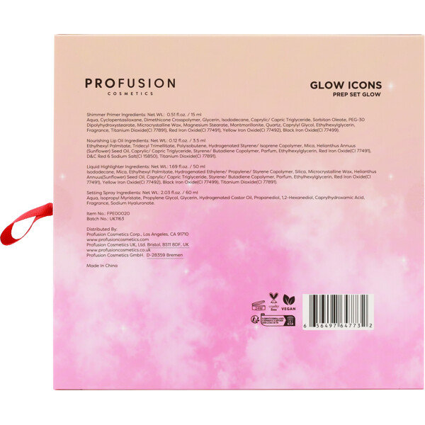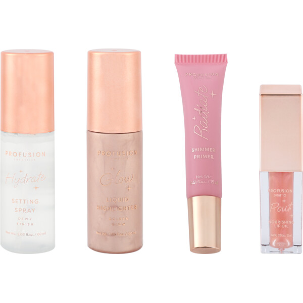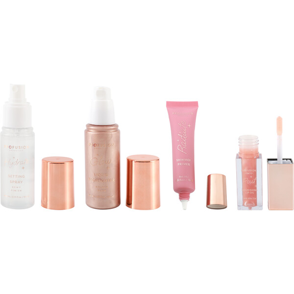 Setet innehåller en primer som jämnar ut hudtonen och ger glow, en flytande highlighter för extra lyster, en närande läppolja som mjukgör och ger glans samt en återfuktande setting spray som låser makeupen på plats.