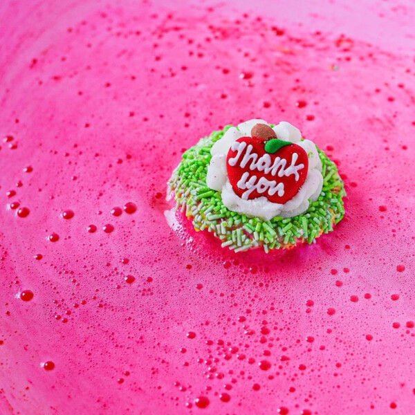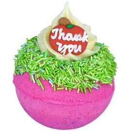 Thank You är en badbomb med en fruktig doft av körsbär och äpple som sprider sig i badet. Den bubblar vackert och innehåller kakao- och sheasmör som gör huden mjuk. Med eteriska oljor av söt apelsin och bergamott blir badstunden en härlig och lyxig upplevelse – helt fri från parabener och konserveringsämnen.