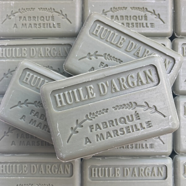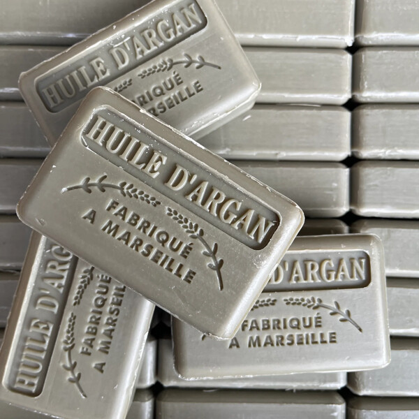Handgjord fransk naturtvål från Marseille med en mjuk, varm doft av arganolja.